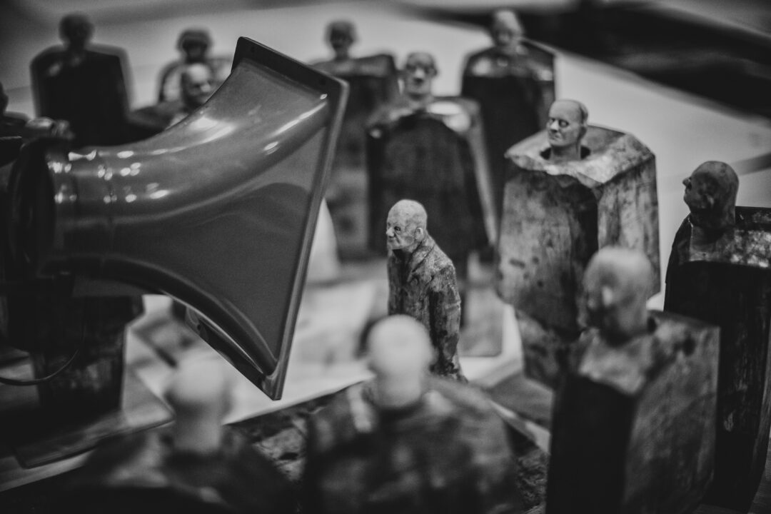 Ces spectacles sont déconcertants – au bon sens du terme, en ce qu’il mettent à mal la consommation passive du spectacle par des spectateurices-consommateurices pour la remplacer par un inconfort fertile qui passe parfois par les thèmes, parfois par des sons à la limite du supportable, et même généralement par le fait de forcer une position debout qui n’autorise pas les corps à se relâcher mollement dans un fauteuil moelleux. Ils sont suffisamment ouverts à l’interprétation pour qu’on y projette ce qu’on veut y voir : là où une personne verra dans l’Opus II une évocation du totalitarisme soviétique et du goulag, donc une vision du 20e siècle, une autre verra un avertissement sur le devenir proche des sociétés européennes notamment, interprétation qui est d’autant plus tentante que les représentations avaient lieu un weekend d’élections municipales. A chacun et à chacune de se faire sa propre idée, donc. En tous cas, il est clair que Le Petit Théâtre du Bout du Monde est une dénonciation, un cri d’alarme silencieux, et qu’il vaut mieux ne pas venir à une représentation en pensant y trouver beaucoup d’espoir – ce n’est pas l’Enfer de Dante, mais c’est un regard sans concession sur quelques-unes des pires inventions de l’humanité.