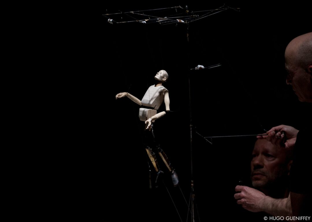 Il semble clair qu’Ézéquiel Garcia-Romeu aime les manipulations à grande distance, qui utilisent à plein les possibilités de jouer dans un grand espace totalement affranchi des limites physiques du plateau. On trouve par exemple dans son arsenal des marionnettes à fils très longs, à manipulation équiplane, semblables à celle utilisée par Aurélie Hubeau dans Alcools. Ce sont des marionnettes qui permettent de regarder la créature sans que les manipulateurices soient dans le cadre, même si les contrôles restent visibles. L’effet produit est très intéressant : le moindre tremblement de la main du ou de la marionnettiste se répercute visiblement dans le corps de la marionnette, qui est gracile, suspendue, effleurant à peine le sol malgré ses pieds lestés… Et elle est en même temps affligée d’une pesanteur métaphorique terrible : bâton de marche dont les coups sonores rythment l’avancée de la marionnette qui ouvre l’Opus II, poids traîné par la marionnette-esclave de l’Opus III.