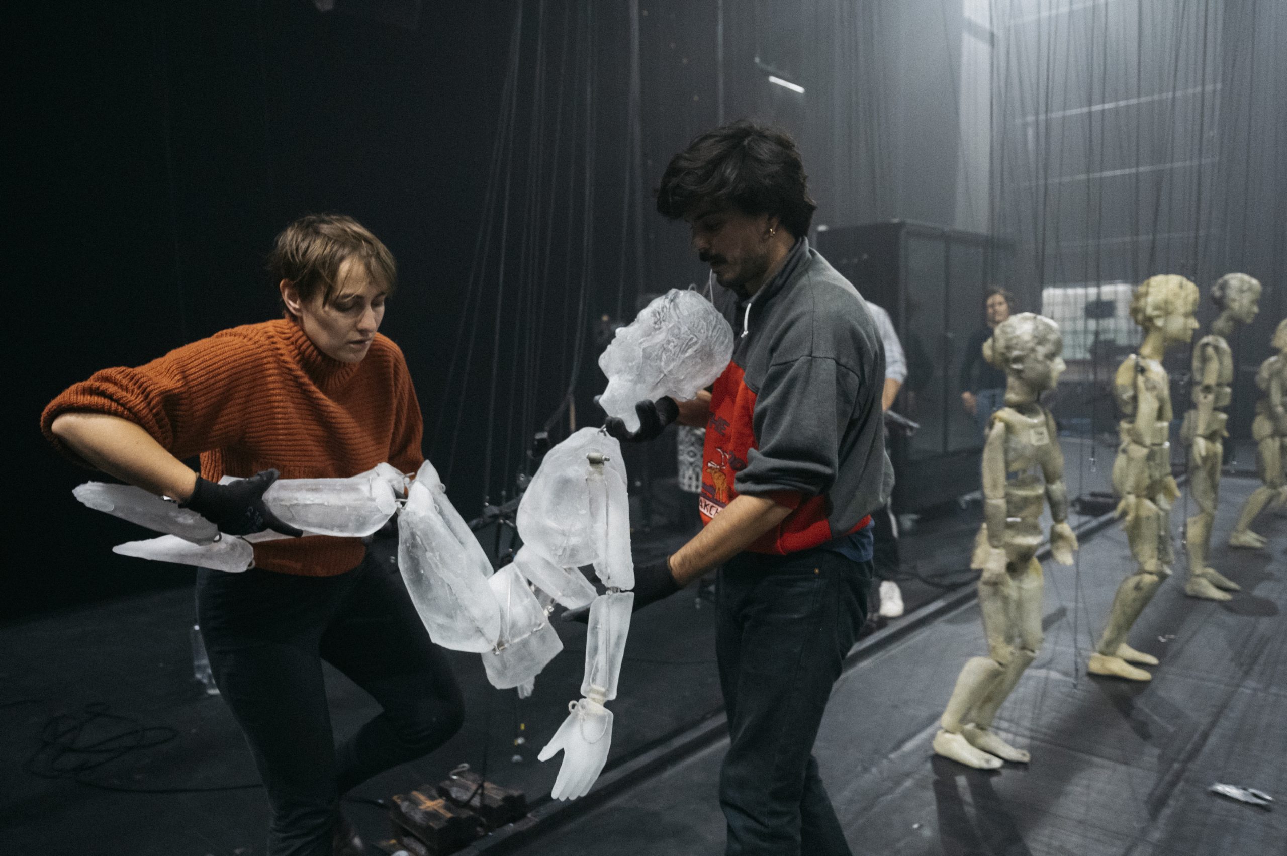 Les marionnettes, comme on pouvait s’y attendre, sont donc faites de glace, le matériau d’élection d’Elise Vigneron. Il ne s’agit pas d’une redite de ce qu’elle avait travaillé précédemment : remettant inlassablement son équipe à l’ouvrage, elle creuse les possibilités techniques et poétiques de l’eau sous forme solide. Le changement d’échelle tenté ici, avec des marionnettes à taille humaine, a contraint l’équipe d’Arnaud Louski-Pane et de Vincent Debuire à trouver de nouvelles façons de faire pour éviter que les marionnettes ne se brisent sous leur propre poids. C’est pour cela, notamment, que leur glace est creuse, en plus de faciliter le processus de solidification.