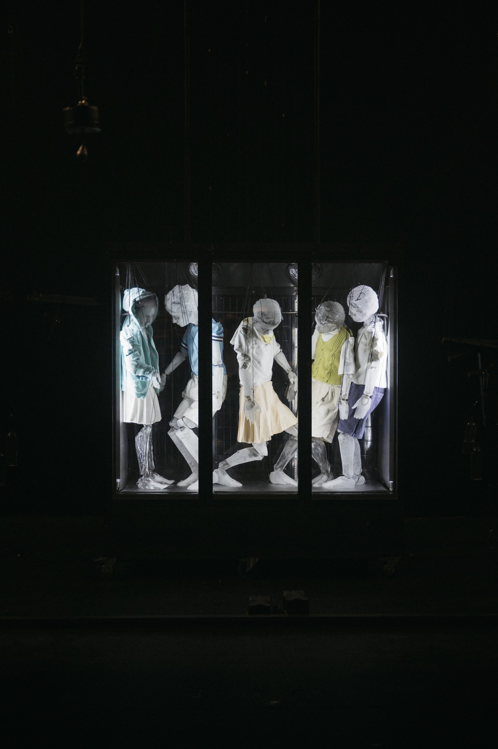 Une boule de glace au bout d’une longe entre en scène, passe et repasse, oscille sous les yeux du public. A peine s’est-on habitué à son mouvement qu’elle se détache et qu’elle se brise au sol, pulvérisée en cent morceaux qui s’éparpille sur le cadre étanche qui s’avérera être un miroir d’eau qui se remplira à mesure de la représentation. La lumière révèle une armoire frigorifique au lointain, et les cinq marionnettes à taille humaine qui y sont entreposées, perçues comme des objets inertes mais déjà troublants du fait qu’elles sont habillées avec des vêtements parfaitement réalistes. Elles semblent avoir attendu de toute éternité que les manipulateur·rices soient prêt·es à raconter leur histoire. Avec de grandes précautions, les cinq interprètes les sortent de leur cercueil glacial et les présentent face public. Commence alors un travail de chœur, chœur à cinq marionnettes au début de la pièce, mais chœur de dix présence parfois quand les marionnettistes elleux-mêmes se mettent en jeu aux côtés des personnages de glace.